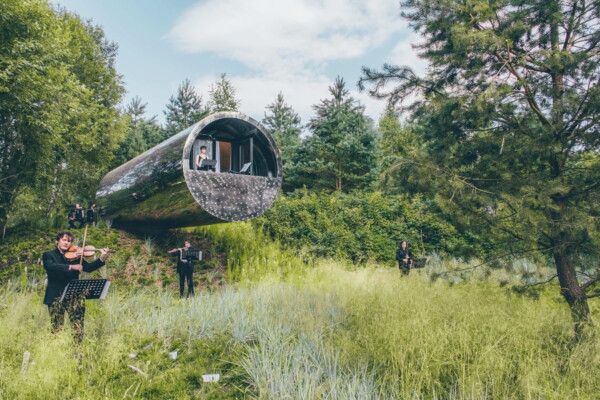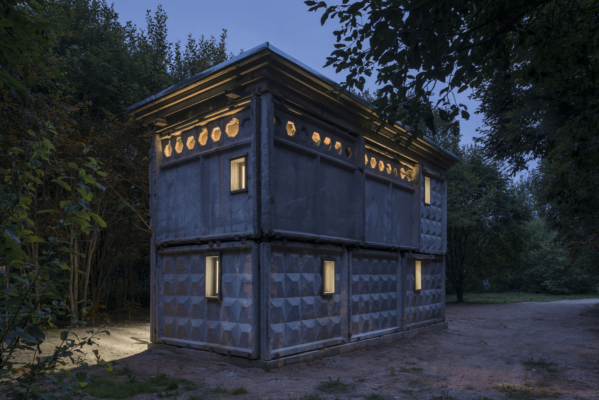 «Удалённый офис» Александра Константинова — пространство, позволяющее «перемещаться от одного рабочего места к другому, меняя открытый вид простора поля на камерность лесного шатра».