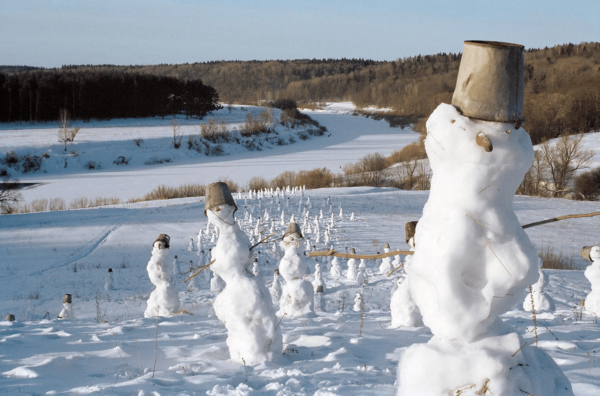 Вот такие всем знакомые одинокие снеговики во дворе каждого дома. Мы придумали, что они вдруг превратились в некий народ. Все как-то откликнулись, и я почувствовал эту народную энергию.