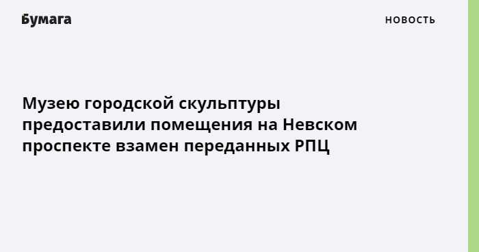 Власти Петербурга предоставили Музею городской скульптуры помещения на Невском проспекте взамен переданных РПЦ. Об этом пишет ТАСС со ссылкой на комитет имущественных отношений.