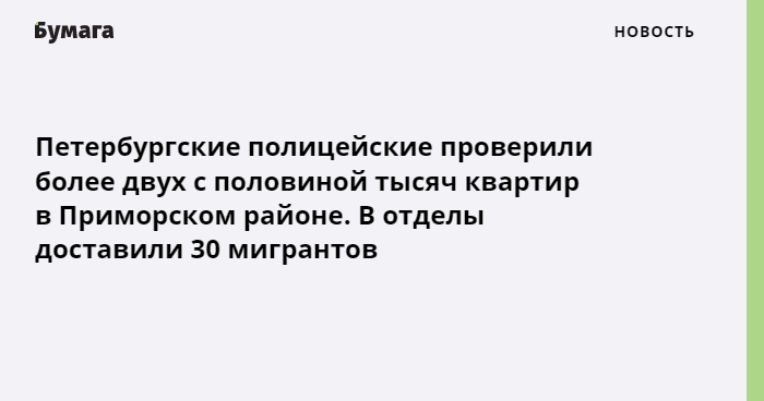 Петербургская полиция провела масштабный рейд по жилым квартирам Приморского района. В результате задержаны 30 человек, сообщили «Бумаге» в пресс-службе ГУ МВД по Петербургу.