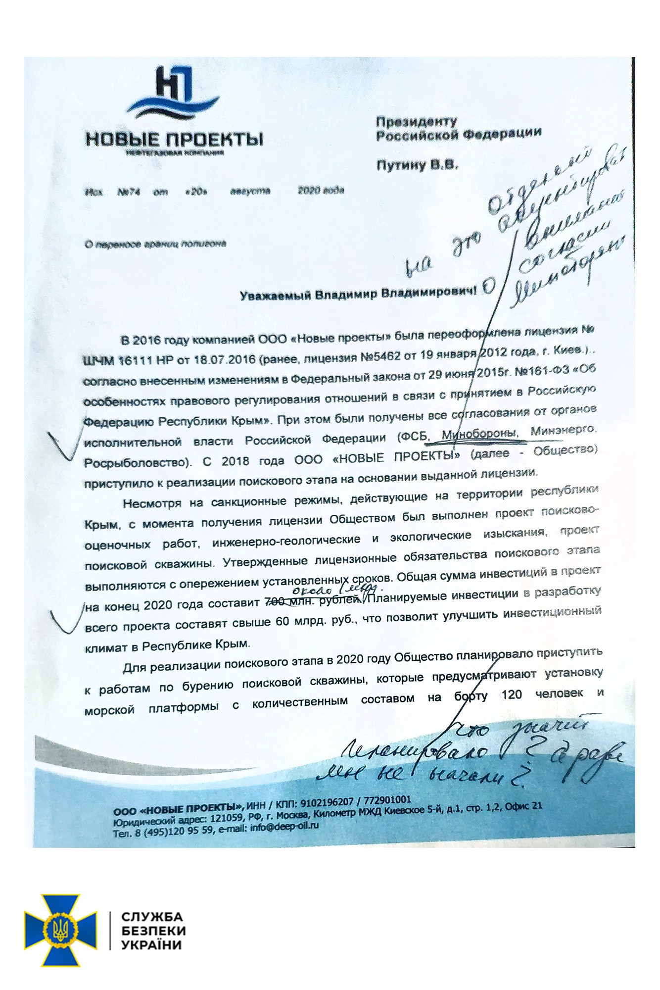 То, что московская фирма «Новые проекты» близка к Медведчуку, уже доказывали и журналисты программы «Схемы». Украинское следствие заявляет, что после оккупации Крыма Медведчук договаривался с Кремлем о перерегистрации украинской компании по российскому законодательству.