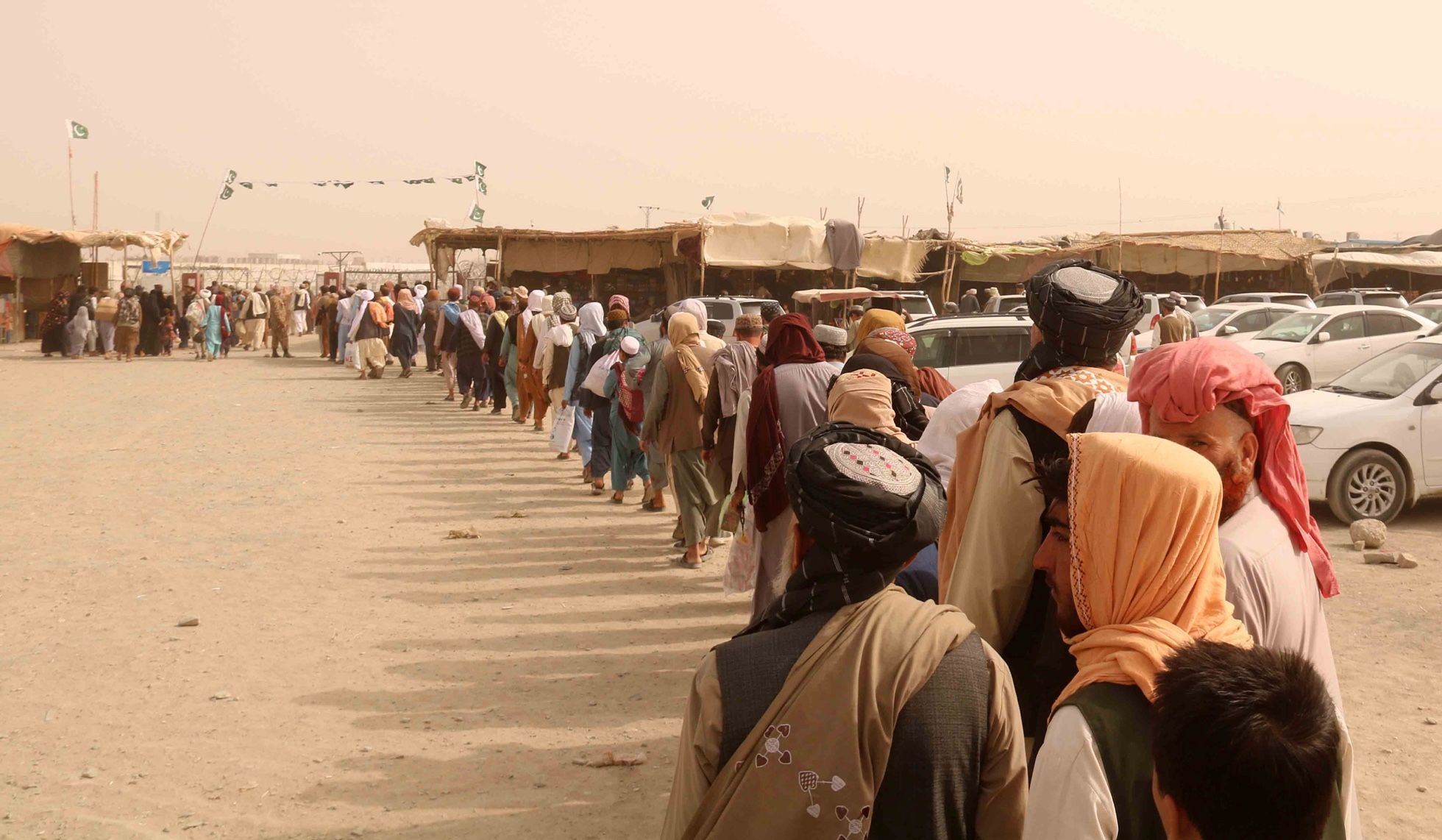 Пока одни всеми силами стараются покинуть Афганистан, другие стоят в очереди на КПП, чтобы вернуться в страну. Фотография