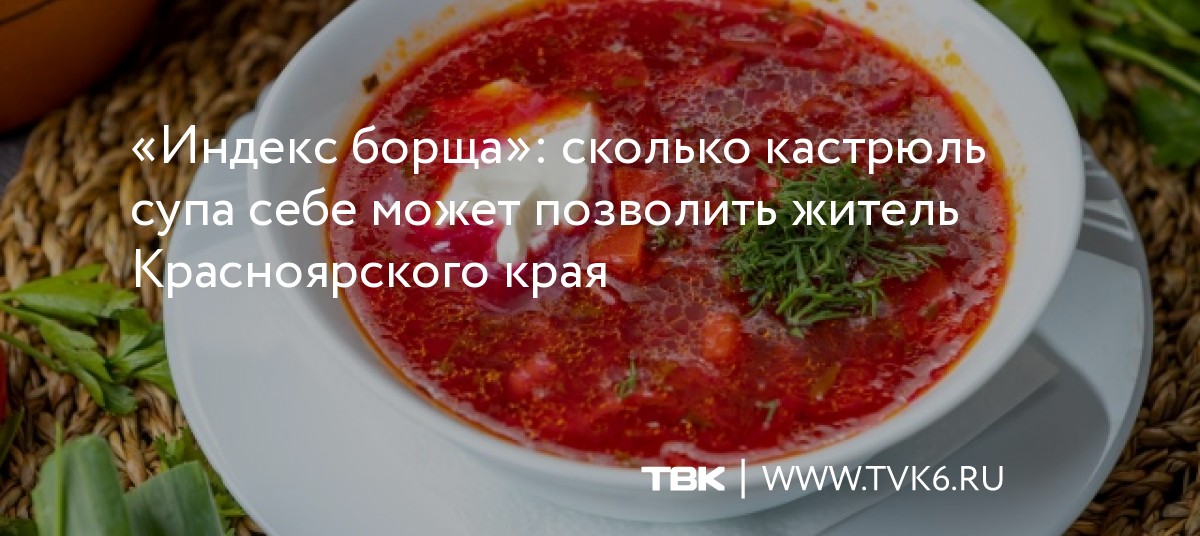 Индекс борща на самом деле – это простой и понятный показатель покупательной способности россиян. Причем оценивается способность покупать не высокотехнологичную продукцию, а стандартную еду. «Ведомости» посчитали средний доход жителей разных регионов и не забыли вычесть из него все налоги и другие обязательные платежи, а также учли цены на продукты – в разных субъектах они разные.«Вообще, это позор. Страна, которая гордится космосом, Гагариным. И думать о цене на борщ – это просто не красиво. Это говорит о том, что мы где-то застряли, что мы в тупике. Обычный россиянин должен думать о цене на новую машину, квартиру, но борщ должен быть по карману любому гражданину. Вот к чему нужно стремиться. Борщ, конфеты и мороженное – вот о чем не должен задумываться человек, и это нормально для нашей страны с ее доходами от нефти и газа», – считает Константин Сенченко, депутат Красноярского городского совета.