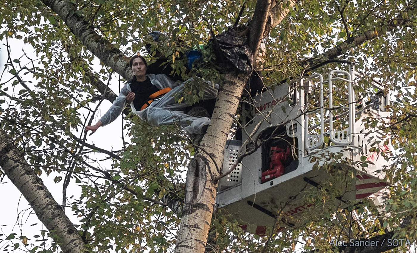 Вскоре к дереву подходит полицейский. Активистка решительным жестом сбрасывает ему свои документы — прямо с дерева на землю. Собираются зеваки, территорию огораживают, подгоняют автозак и пожарную машину с лестницей. Первый контакт оказался неудачным, и спасатели спускаются ни с чем.