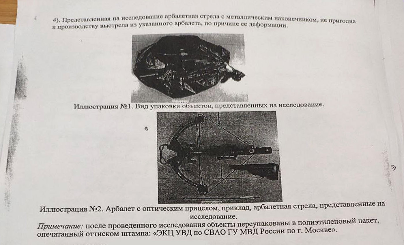 В постановлении о возбуждении дела , ссылаясь на справку об исследовании оружия, указывает, что изъятый у Кузьминой арбалет предназначен «для спорта, отдыха и развлечения и холодным оружием (метательным) не является». При этом в документе не упоминается, что, согласно , арбалет и стрела от него не пригодны для стрельбы из-за неисправности спускового механизма и деформации самой стрелы.