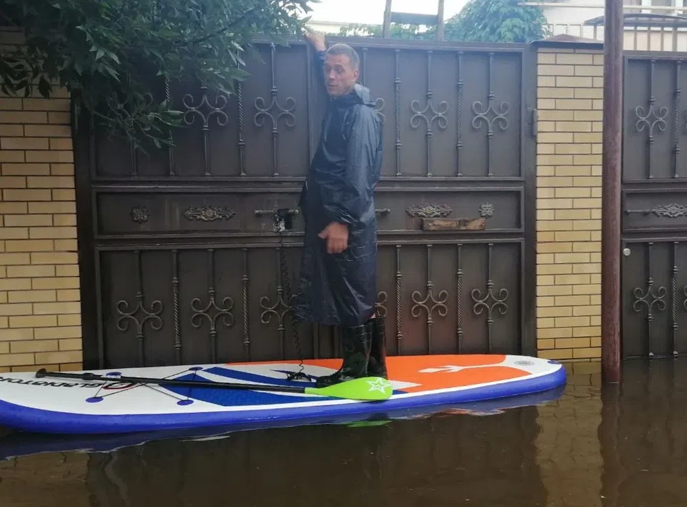 …На SUP-доске, с веслом в руке, в темном дождевике Руслан Попенко медленно гребет к своим воротам, где начинается самое сложное: воды на улице — до самой ручки, надо изловчиться и открыть калитку, но сделать это, стоя на надувной доске, не так-то просто. Спускаться в воду неприятно, она коричневая, в радужных разводах — следы от утонувших машин. Иногда к ногам противно липнут пластиковые пакеты.
