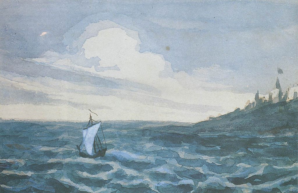 Так, «родной край». Ассоциации такие: тепло, уют, родная земля, матушка, которая оберегает… Но тут пишет он глагол такой: «кинул». Не оставил, кинул. И для меня это сразу такие мысли: значит, для него не было там того, за что бы он мог зацепиться, там не было ему места, но — «Что ищет он в стране далекой?» — он еще ничего не нашел. Он находится в поиске. Это тотальное одиночество поиска. Заметим: когда мы выходим в море, оно бескрайнее.