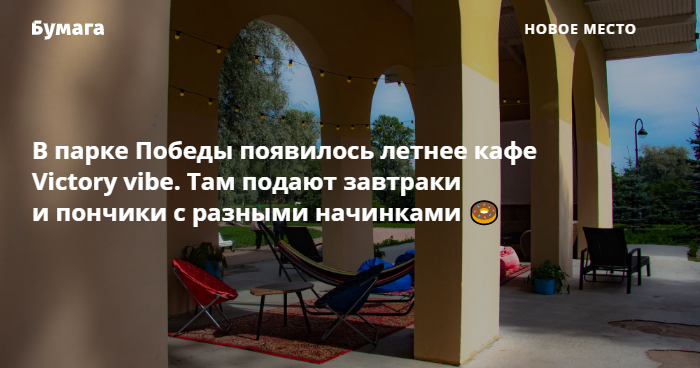 В парке Победы открыли летнее кафе Victory vibe, рассказала «Бумаге» создательница проекта Марина Данилина. Марина и ее муж работают неподалеку от парка — они решили открыть кафе, так как рядом не было мест, где можно отдохнуть или пообедать.