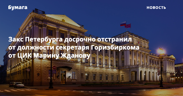 Закс Петербурга проголосовал за досрочное прекращение полномочий секретаря петербургской избирательной комиссии Марии Ждановой. Ее назначили в состав петербургской избирательной комиссии по рекомендации ЦИК по квоте петербургского парламента, сообщает «Фонтанка».
