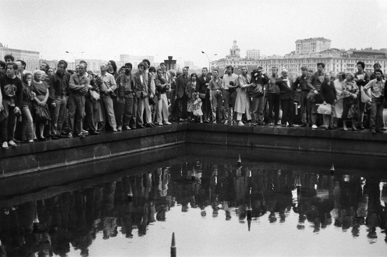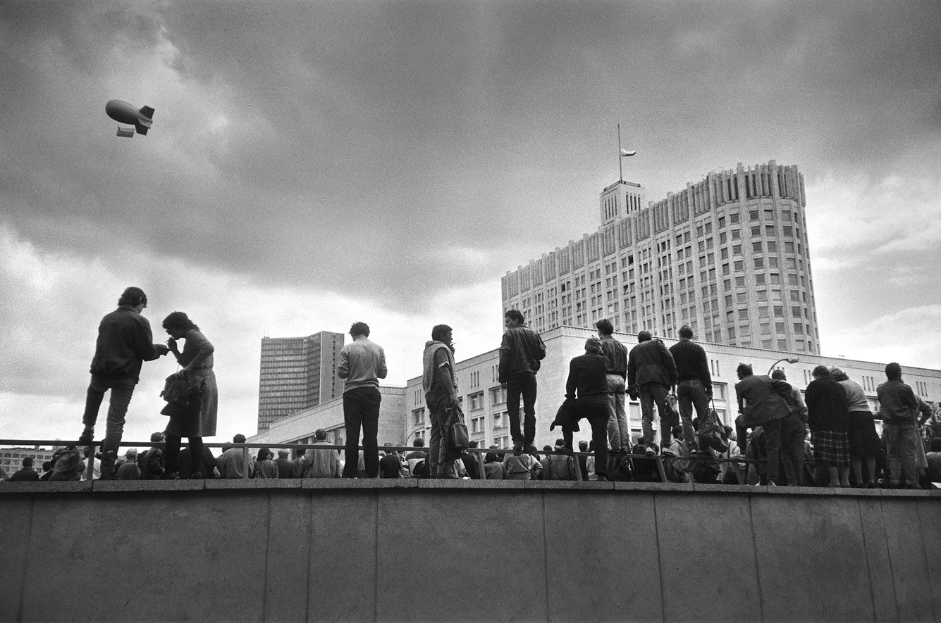 Пандус Белого дома, люди слушают чье-то выступление из окна. Из Белого дома с помощью микрофона просто доводили до людей текущую ситуацию, там тогда сидело много людей, которым мы доверяли, начиная от программы «Взгляд» в полном составе. Других источников не было, потому что газеты не выходили, интернета не было. Узнавать, что происходит, можно было по радио «Эхо Москвы», но его периодически отрубали.