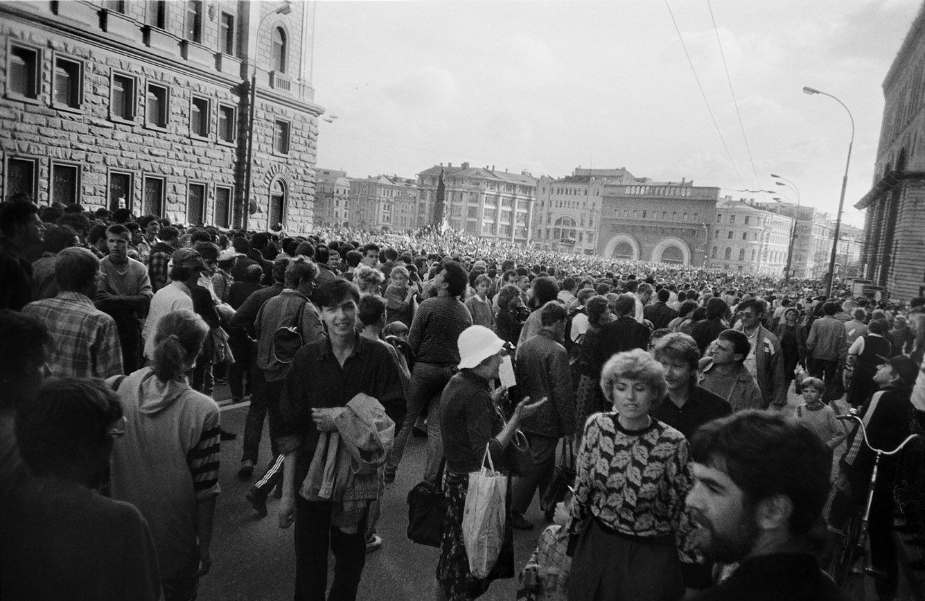 Гражданское оцепление вокруг здания КГБ на Лубянке 21 августа. После того, как танки увели, стало понятно, что все, конец, и на улицы вывалило огромное количество народу. Было ощущение, что это день победы.