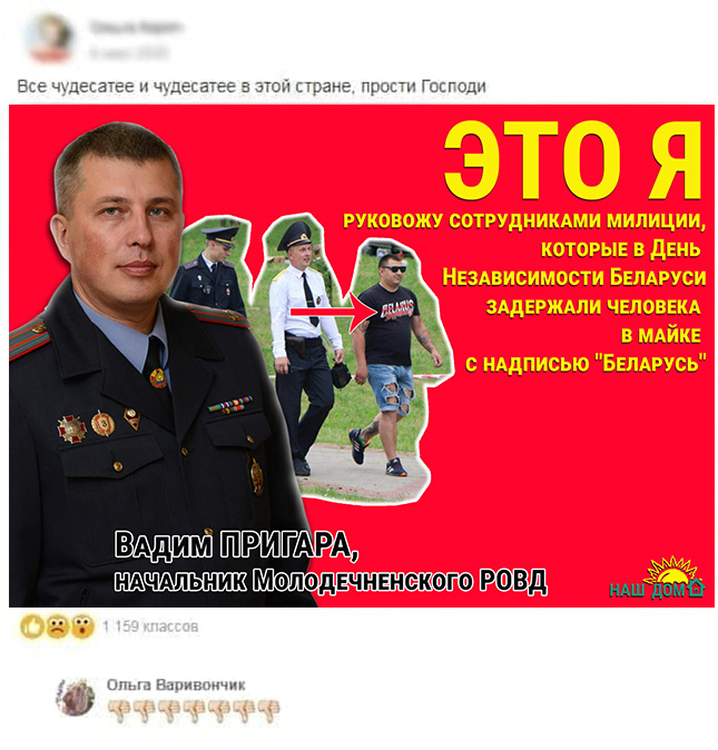 Судья суда Советского района Минска Сергей Шацила приговорил местную жительницу Ольгу Варивончик к двум годам "домашней химии" (ограничения свободы без направления в исправительное учреждение) по делу об "оскорблении" милицейского начальника. Как сообщает правозащитный центр "Весна", Варивончик преследуют за два комментария, один из которых, по данным "Весны", действительно был оскорбительным и ныне удален, а другой представлял собой несколько эмодзи "большой палец вниз".