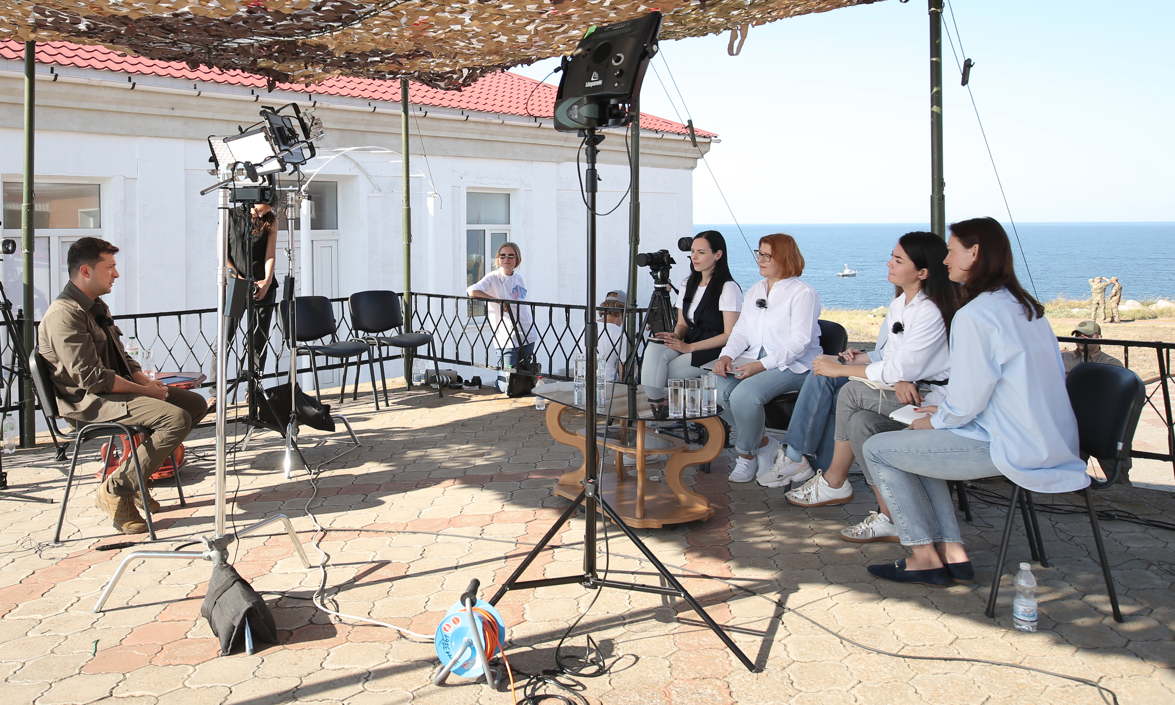 Владимир Зеленский встречался с украинскими журналистами из Крыма на острове Змеиный в Черном море, где в тот момент проходили военные учения морских пехотинцев и группы спецназа при поддержке авиации и надводных сил.