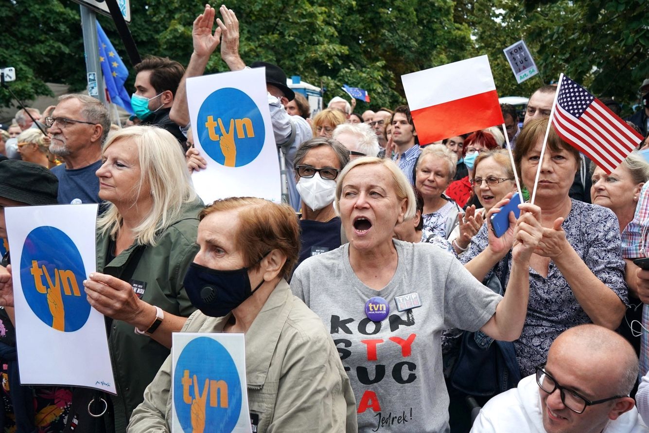 В Польше — кризис из-за нового законопроекта, предложенного правящей консервативной партией «Право и справедливость» и уже принятого сеймом. Он накладывает ограничения на иностранных собственников польских медиа — и по всей видимости, направлен против одного конкретного холдинга, на каналах которого регулярно критикуют действующее правительство. Причем, чтобы добиться полного контроля над СМИ, власти готовы рискнуть очень многим. Специально для «Медузы» журналист Станислав Кувалдин объясняет, чем чреваты такие решения для польских властей.