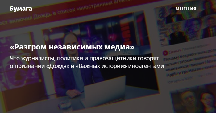 — «Дождь» и «Важные истории» объявили СМИ-иноагентами. То, что с главным и единственным оппозиционным телеканалом еще захотят поквитаться, было очевидно, но, честно сказать, я ошибался. Я думал, что до выборов его не тронут, чтобы сохранить хотя бы видимость полемичности повестки и свободы слова.