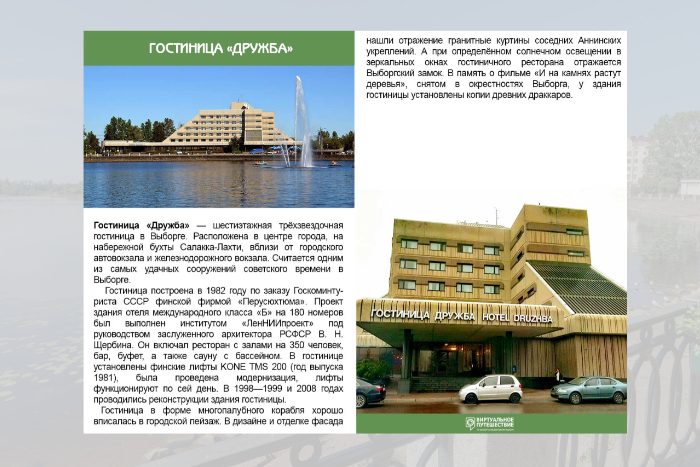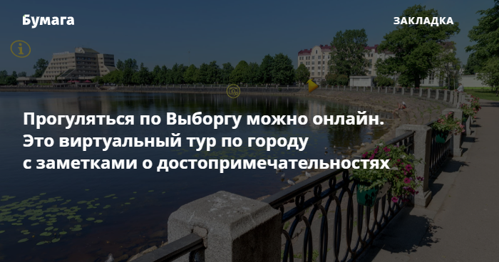 «Виртуальное путешествие по Выборгу» — это портал, с помощью которого можно в онлайн-формате прогуляться по улицам и больше узнать о главных достопримечательностях города. Например, на сайте рассказывается о руинах кафедрального собора, гостинице «Дружба» и рынке.