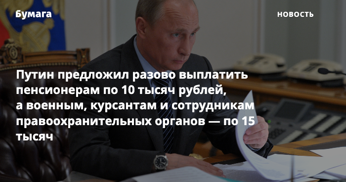 Обновление от 24 августа в 18:31. Владимир Путин также предложил, чтобы курсанты военных училищ и сотрудники правоохранительных органов также получили единовременную выплату в 15 тысяч рублей. Президент уточнил, что все военные должны получить выплату в размере 15 тысяч рублей.