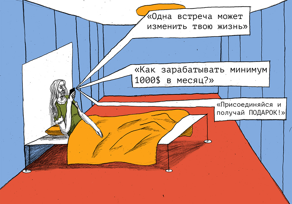 Людмиле 71 год. Она живет в таежном Усть-Илимске и каждое утро прямо с кровати начинает с публикации постов в фейсбуке, во «ВКонтакте» и в «Одноклассниках»: «Одна встреча может изменить твою жизнь», «Как зарабатывать минимум 1000 долларов в месяц? Рекомендую нажать на ссылку», «Присоединяйся и получай ПОДАРОК!».