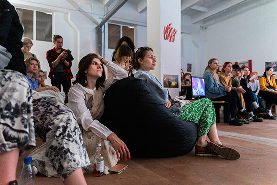 Во время резиденции художниц в Архангельске мы создали лабораторию живого перформанса «Близость» для местных жителей. Мы хотели отрефлексировать опыт, который возник у людей после локдауна, когда нам снова нужно было научиться друг друга чувствовать и узнавать. Ее итогом стал одноименный перформанс с элементами вербатима, в котором участники, перемещаясь в пространстве выставки, рассказывали о своем опыте переживания близости.