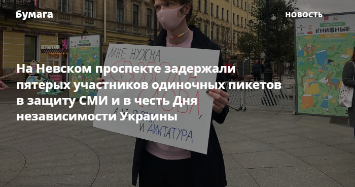 В Петербурге на Невском проспекте задержали пятерых участников одиночных пикетов. Двое из них вышли на акцию в честь Дня независимости Украины, трое — на пикеты в защиту СМИ. Об этом сообщает «ОВД-Инфо» со ссылкой на задержанных.