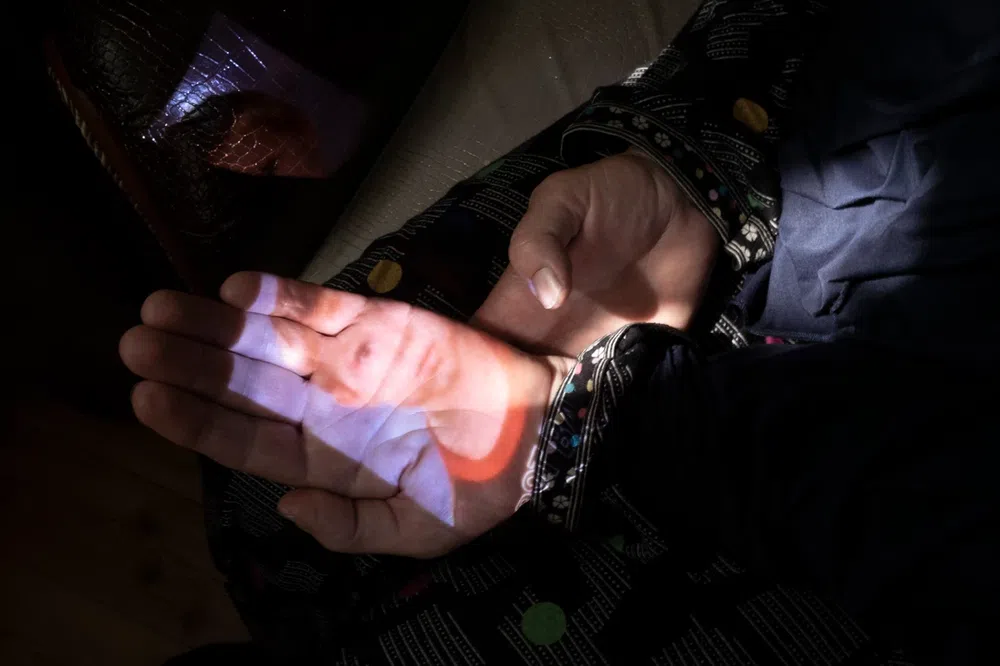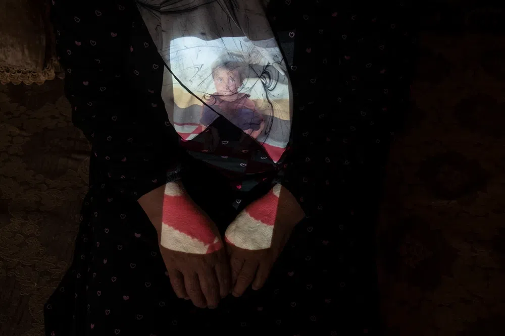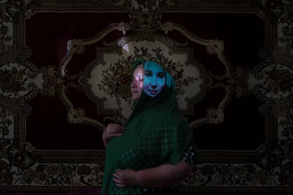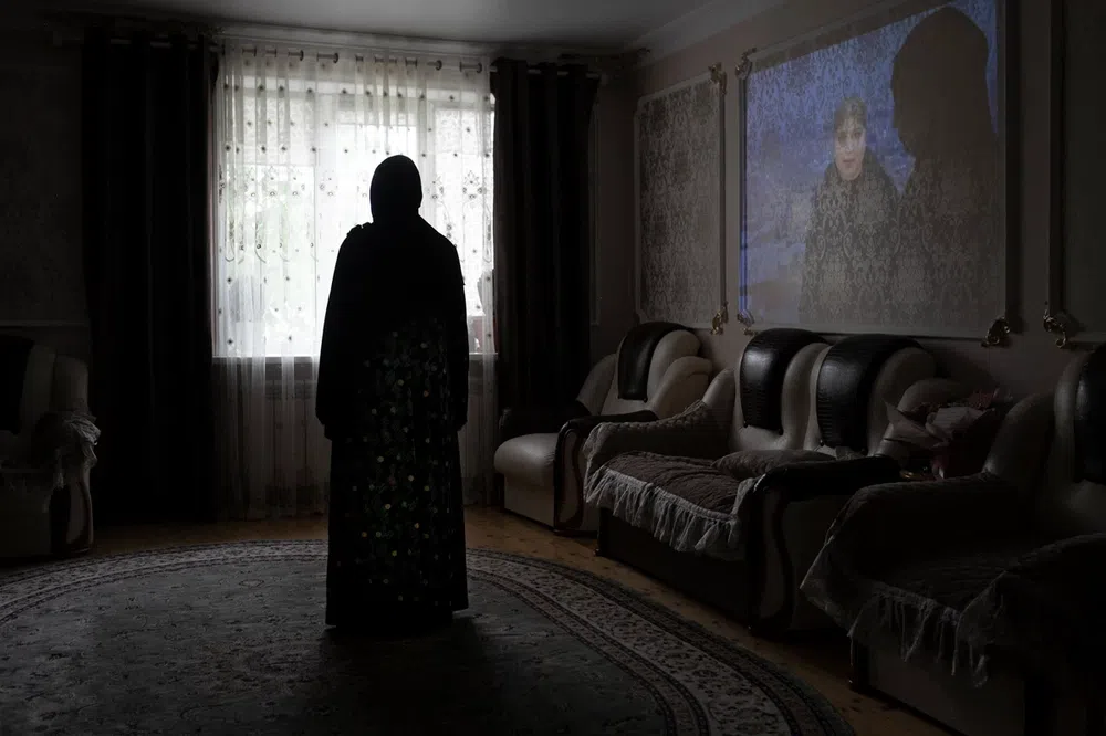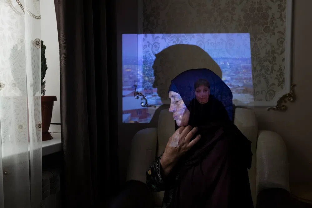 По данным МВД Дагестана, вплоть до 2017–2018 годов количество уехавших составляло от 300 до 500 человек ежегодно, но по неофициальным источникам — намного больше. Молодые семьи оставляли в Дагестане своих родителей. Конфликт разрушал семьи и связи между целыми поколениями. Большинство мужчин, уехавших воевать, погибли. В то время как молодые девушки с детьми на руках остались без средств к существованию и крыши над головой. Часть из них пропали без вести, часть оказались в плену, тюрьмах или в невыносимых условиях лагерей для беженцев. Их родители, матери, бабушки готовы на все, чтобы вернуть своих детей назад в Дагестан. Они спят в обнимку с телефонами — там вся их жизнь: надежда на телефонную связь с родными, группы взаимопомощи матерей, где женщины обмениваются информацией, цепляясь за любые ее крохи в попытках помочь своим детям и внукам. Я рассказываю краткие истории девушек, находящихся в Сирии и Ираке, устами их матерей. Проецирую фотографии девушек и внуков на фигуры матерей и бабушек. Пытаюсь показать неразрывную, родственную связь между ними.