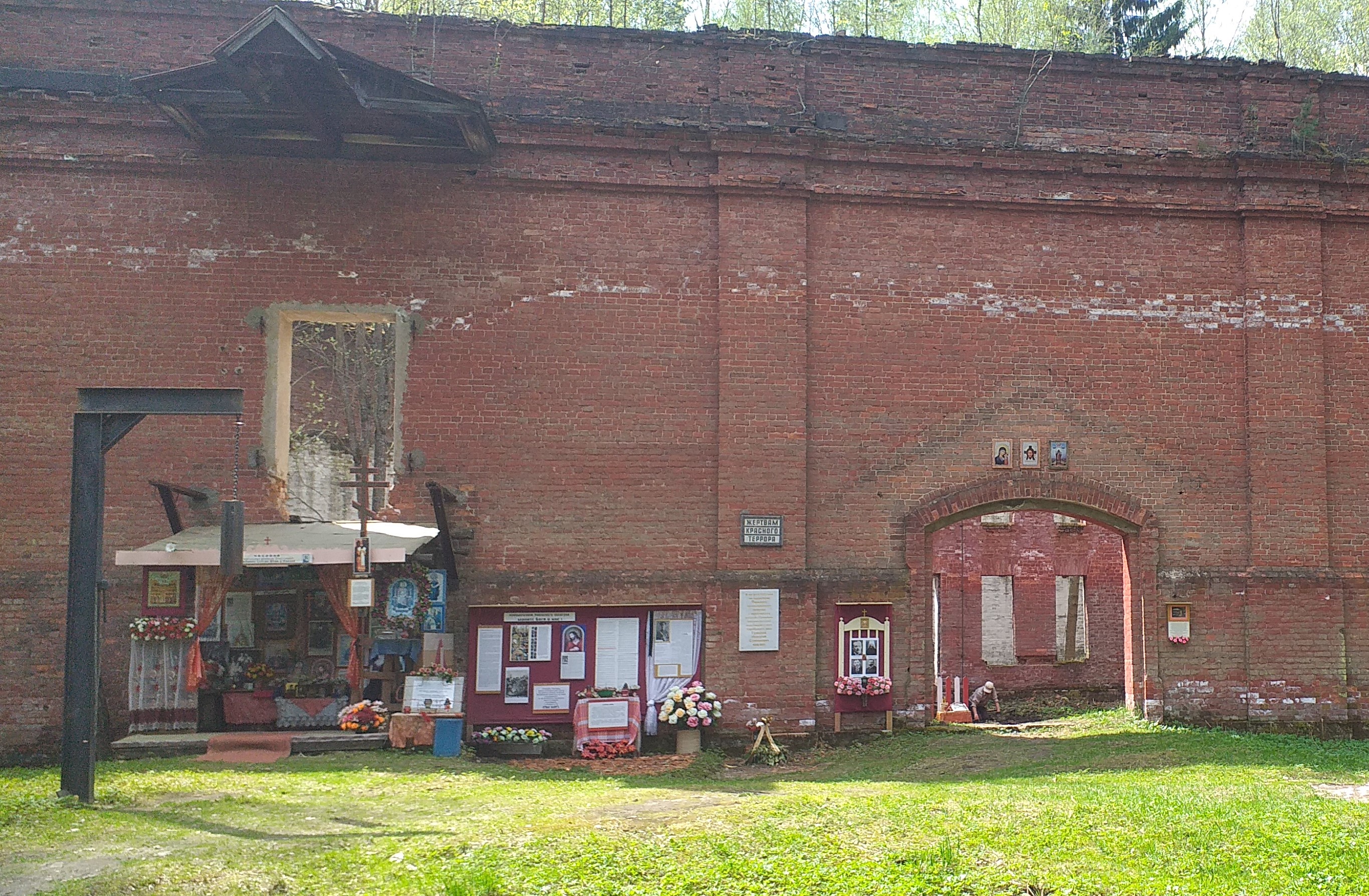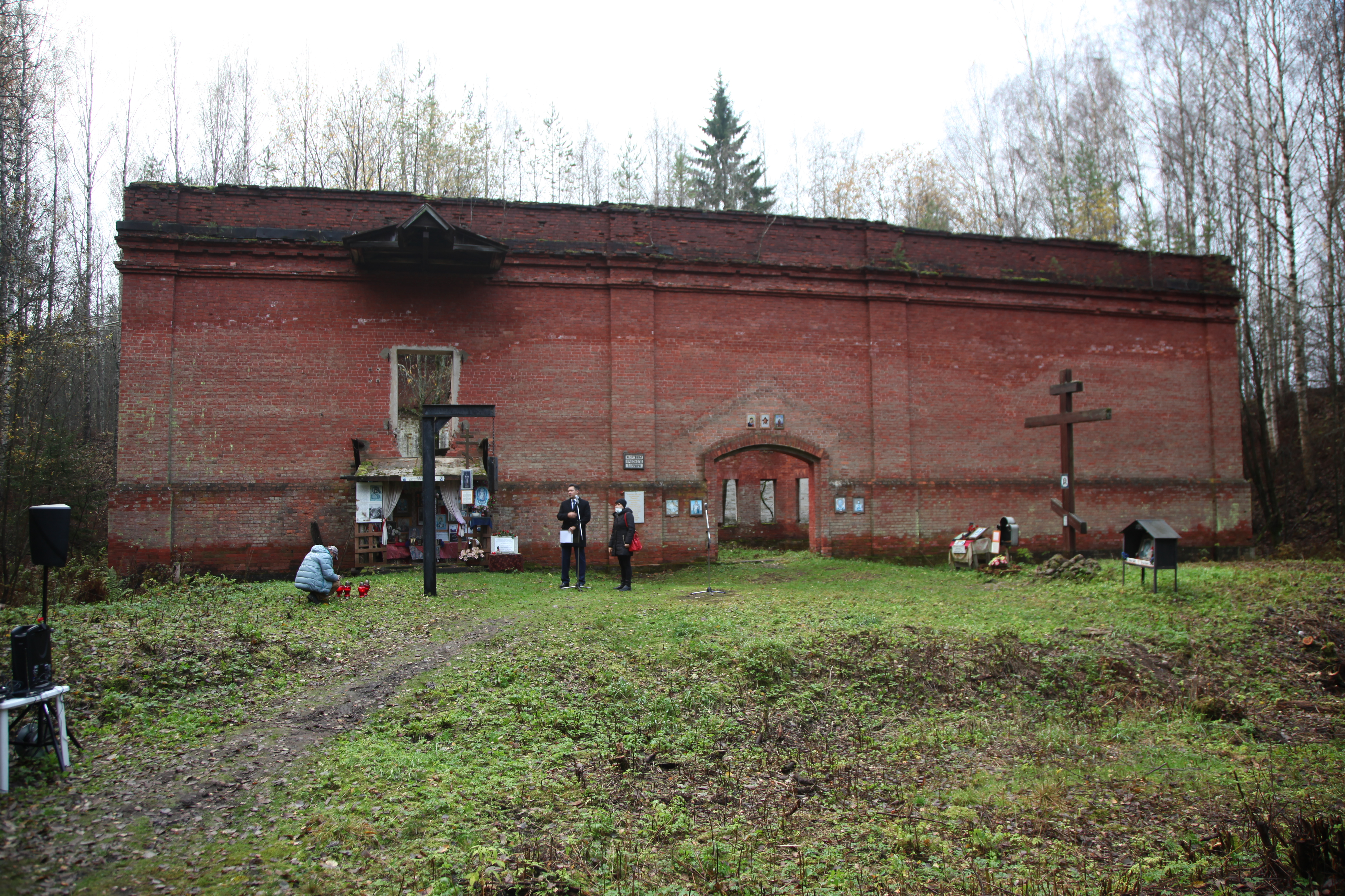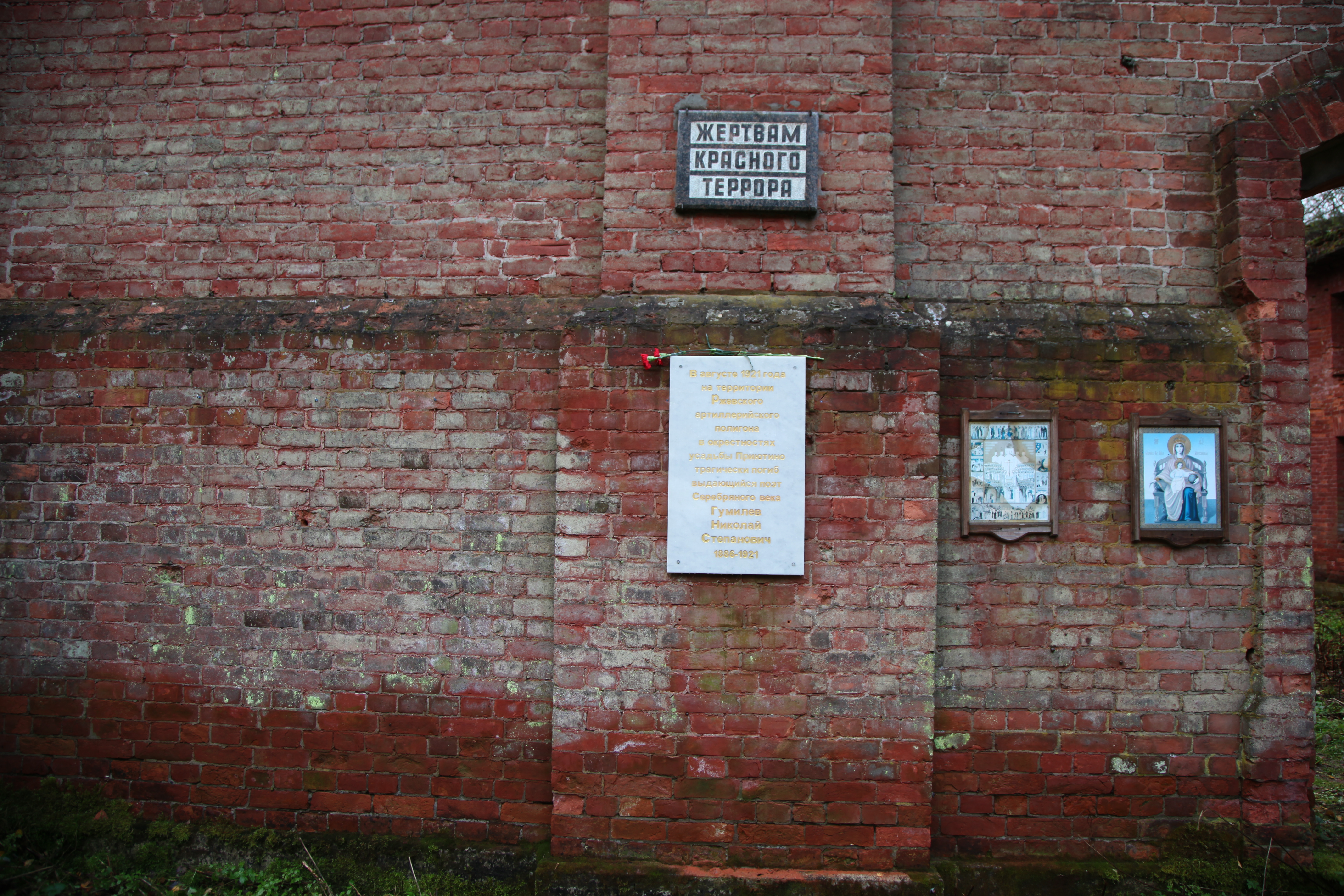 – Когда мы туда пришли, там была маленькая табличка, ранее установленная "Мемориалом", – "Жертвам красного террора". Потом этот накопитель использовался как склад, и есть свидетельства о том, что когда разбирали доски внутри него, то на них были надписи со словами – мы не виновны, погибаем зря, с проклятьями и мольбами. В 1990-е годы склад разграбили, добротные доски пошли на стройматериалы. Один человек нам рассказывал, что не решился взять себе хоть одну доску с этими страшными словами, но его соседям было все равно. Мы решили сохранить это место для людей, для будущего. Так как там везде вода, не пройти, мы обустроили дорожку – там насыпано машин 30 песка и проложены доски метров на 300, а дальше идет брусчатка. На здании табличка о том, что вблизи этого места "трагически погиб" Николай Гумилев, мы ее нашли на полу в заброшенном музее Ржевского полигона. Там есть еще таблички разным людям, но, видимо, заказывали их в 90-е годы люди, еще не готовые написать прямо: расстрелян. Мы сейчас работаем над тем, чтобы повесить там нормальную мемориальную доску, где будет это слово – "расстрелян", но и ту табличку сохраним как памятник эпохе. Там у нас установлен лагерный набат – рельса, согнутая буквой "г", в которую посетители могут ударить.