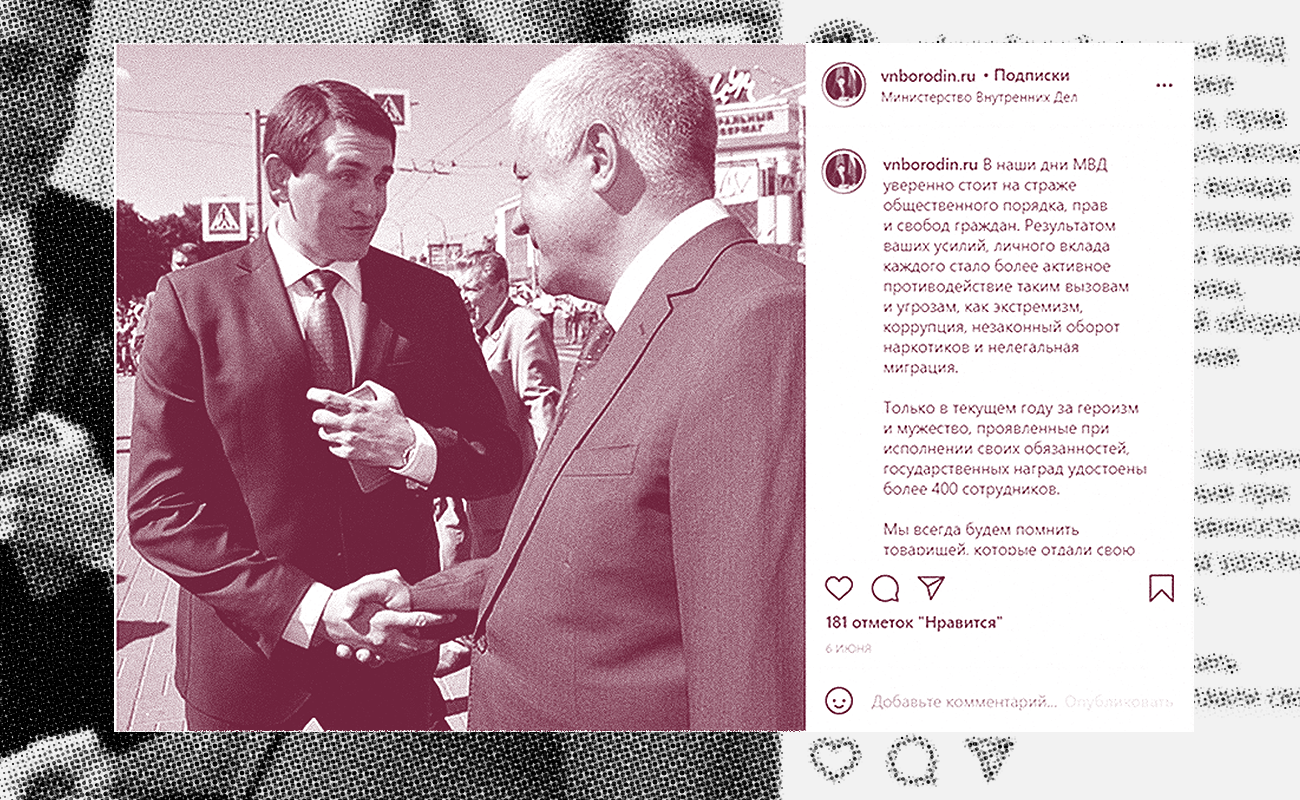 «Он как Труффальдино из Бергамо! — рассказывает „Медузе“ бывший чиновник, хорошо знающий Бородина. — На мероприятиях за ним все время фотограф ходит — я так понял, личный. Бородин специально подходит познакомиться, его в это время фотографируют — а он потом выкладывает снимок: „Вот я с генералом таким-то, обсудили важные вопросы, ищем пути решения“. Ему пропуск в прокуратуру сделали — а он возле кабинета [бывшего генпрокурора Юрия] Чайки стал видео снимать, будто к Чайке сейчас зайдет на совещание».