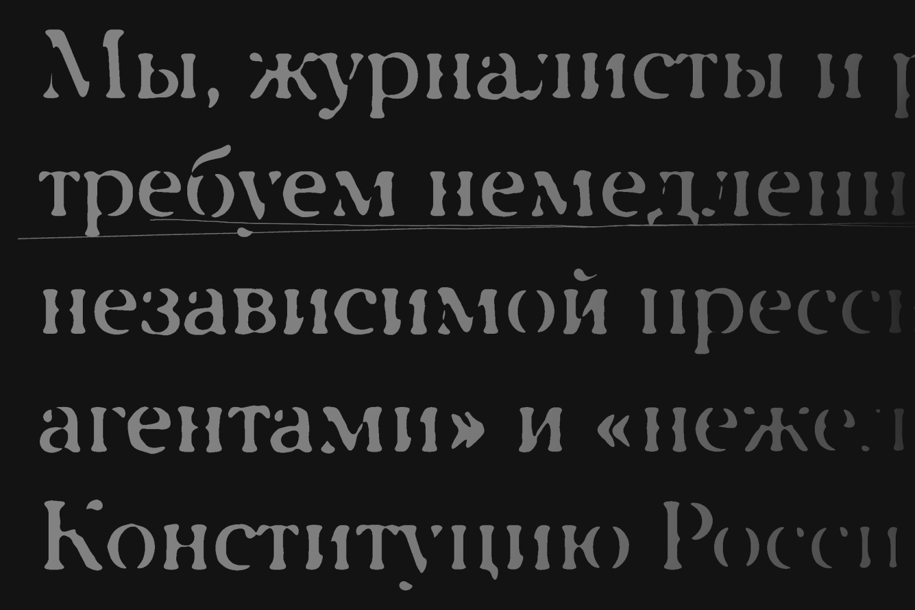 Мы, журналисты и редакторы российских и русскоязычных СМИ, требуем немедленно прекратить государственную кампанию против независимой прессы. Объявление СМИ и граждан «иностранными агентами» и «нежелательными организациями» прямо нарушает Конституцию России, Закон о СМИ, Уголовный кодекс, Всеобщую декларацию прав человека, которые гарантируют свободу СМИ. Эти статусы приводят либо к ликвидации СМИ, либо создают дискриминирующие условия для их работы, прямо ограничивают профессиональную деятельность журналистов.
