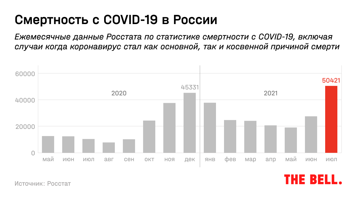 За все время пандемии в России, то есть с апреля 2020 года по июль 2021 года, количество умерших с COVID-19 достигло 367,5 тыс. человек, следует из расчетов The Bell на основании данных Росстата.
