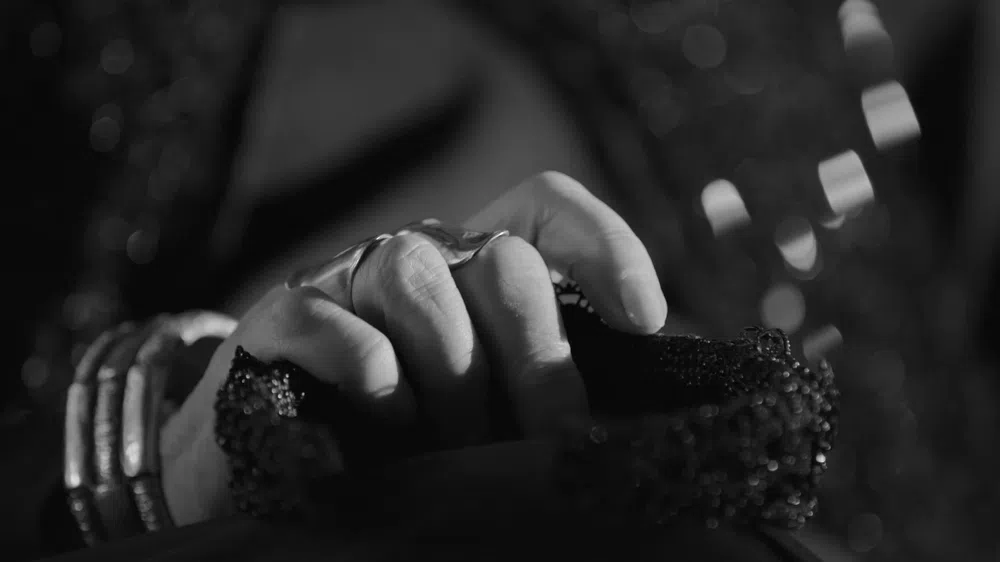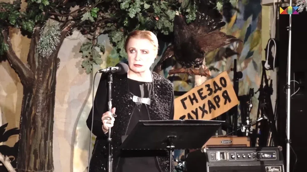 Наблюдаем, как она располагает себя на сцене, дирижирует камерой, микрофоном. Готовится. И зрительницы, пришедшие на встречу с ней, в гардеробе филармонии переобуваются в туфли. Готовятся к встрече. Так было еще вчера. Сегодня она, как всегда капризничая, едет на выступление в «Гнезде глухаря». Читает Бродского. «На сетчатке моей — золотой пятак. Хватит на всю длину потемок». Зрители продолжают пить, жевать, разговаривать. Ее руки в кольцах хватаются за микрофон, как за соломинку — пытается выскользнуть из «черной пустоты».