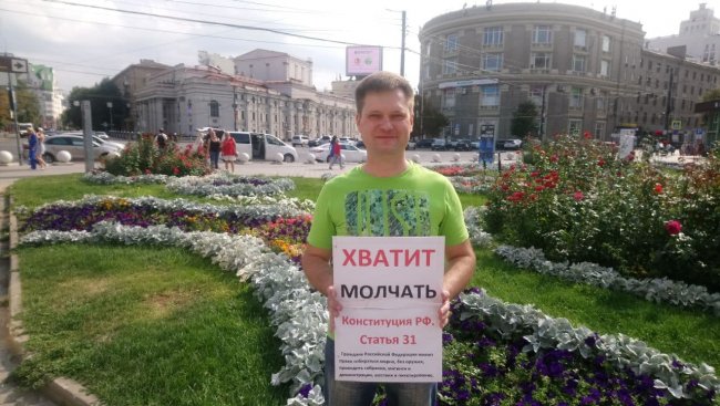 Пикетчик держал плакат с надписью «Хватит молчать» и текстом 31-й статьи Конституции.