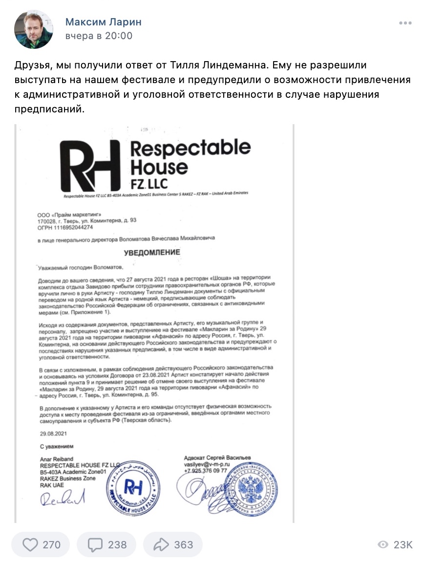 Дальше, по его рассказу, полицейские блокировали автомобили на подъезде к месту проведения фестиваля, так что группа Линдеманна не смогла провести репетицию. Кроме того, в гостиницу к немецкому рокеру пришли полицейские, которые, по данным «Интерфакса», выдали ему предписание не проводить концерт из-за коронавируса.