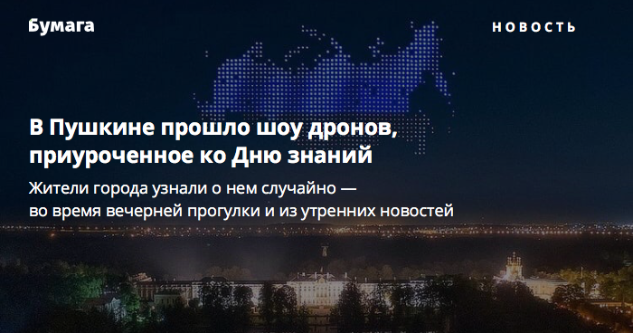 В Пушкине в преддверии Дня знаний состоялось шоу дронов. В социальной сети «ВКонтакте» местные жители возмущены, что о проведении мероприятия заранее никто не сообщил: пушкинцы узнали о нем уже постфактум из телевизионных новостей и постов в районных пабликах.