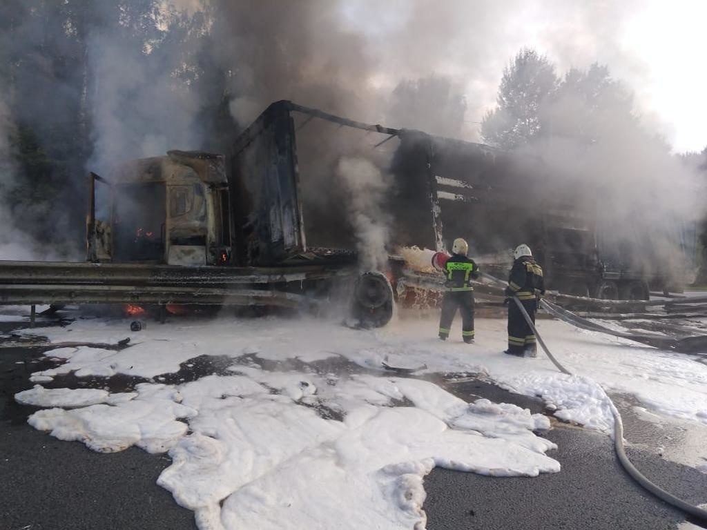 Водитель большегрузного автомобиля не справился с управлением и врезался в дорожный отбойник. В результате фура вспыхнула. На место происшествия незамедлительно выехали подразделения МЧС и ГИБДД.