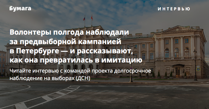 ГС: Да, интерес к наблюдению на выборах есть и его нужно поддерживать. Можно записываться через любой формат: «Наблюдателей Петербурга», «Голос», Общественную палату. Плюс у нас есть другие инструменты, которые позволяют сообщить о нарушениях до дня голосования. Например, карта нарушений «Голоса». Сейчас будет активизироваться административный ресурс, давление на граждан, которые зависимы от своего работодателя. Ни то ни другое не является легальным способом ведения политической борьбы и агитационной кампании.