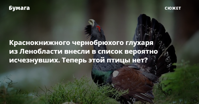 Минприроды заявило, что из Ленобласти, вероятно, исчезли все чернобрюхие глухари, которых год назад занесли в Красную книгу. Как выяснила «Бумага», пропажа этих птиц — не факт: чернобрюхого глухаря почти не отличить от других подвидов. При этом на обычных глухарей открыта охота.