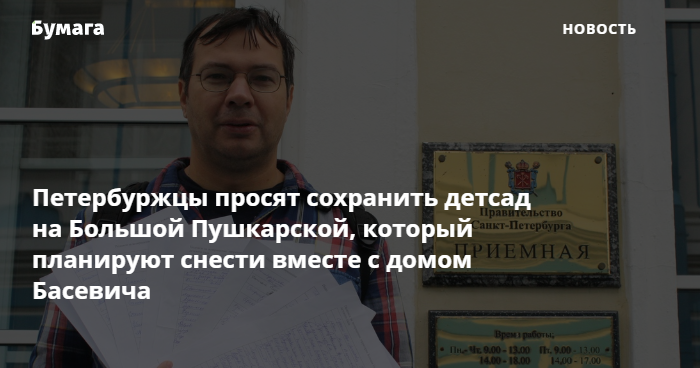 Жители Петроградской стороны собрали 200 подписей против сноса детского сада № 93 на Большой Пушкарской улице и передали их губернатору Петербурга Александру Беглову. Об этом сообщается в паблике «Спасти дом Басевича».