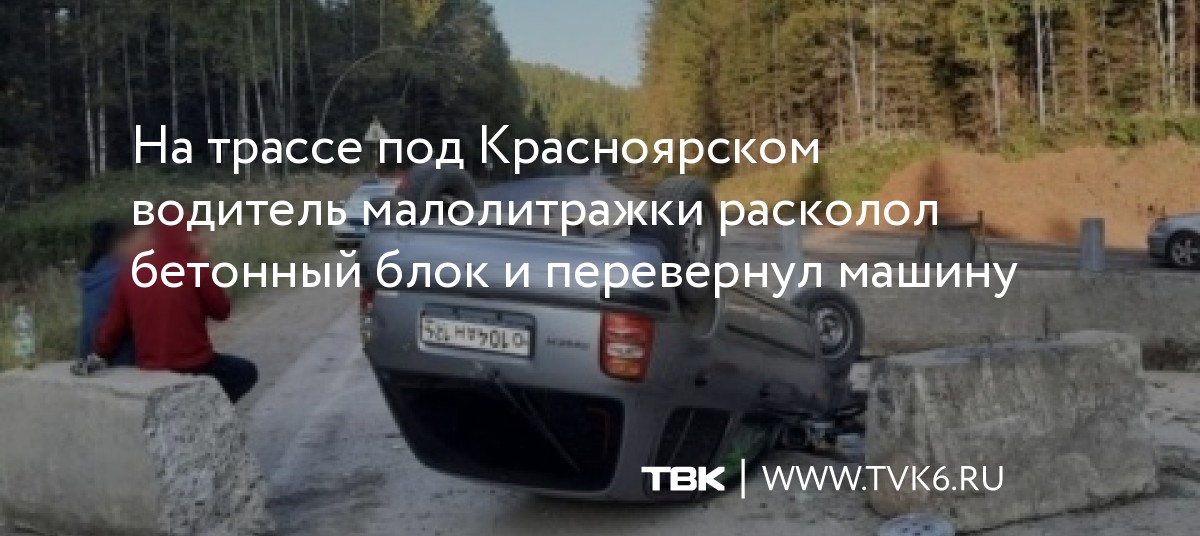 На трассе под Красноярском водитель малолитражки расколол бетонный блок и перевернул машину