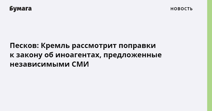 Кремль рассмотрит обращение СМИ с предложением внести поправки в закон об иностранных агентах. Об этом сообщает «РИА Новости» со ссылкой на пресс-секретаря президента Дмитрия Пескова.