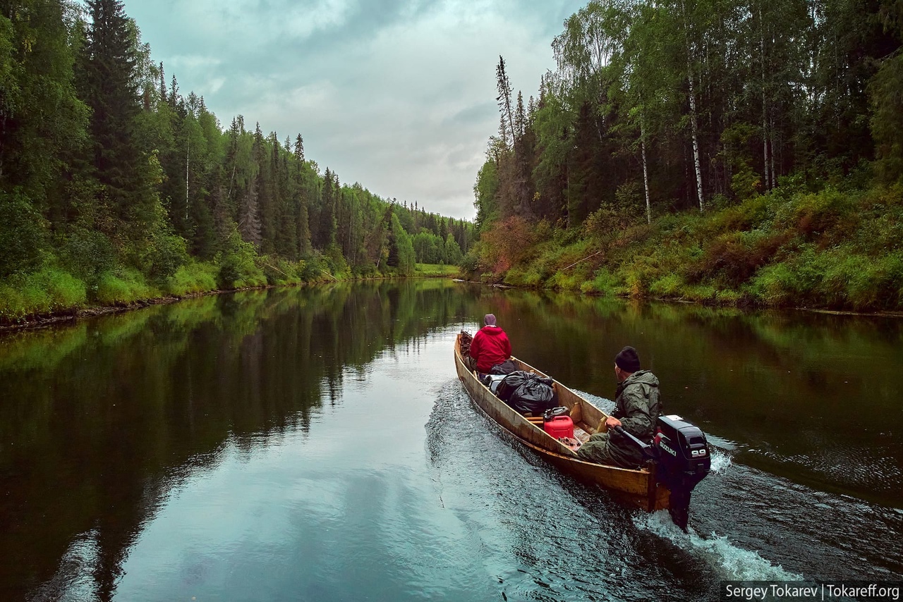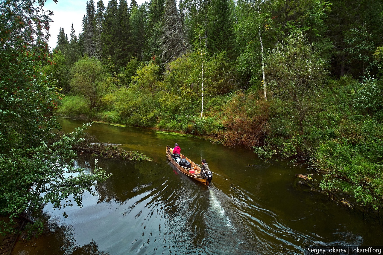 Идти на лодке по речке Черь дело не простое. Нужна не только специальная лодка, но и особая сноровка – проводить мотор по отмелям, читать рельеф дна по рисунку воды. А еще сила – толкать груженую лодку шестами против течения по перекатам. Поэтому в эти края не многие ходят. К счастью, отец провел на реке все детство и до сих пор помнит особенности русла. До заката поднимались, прошли около 70 км. Последний участок двигались почти полностью на руках.