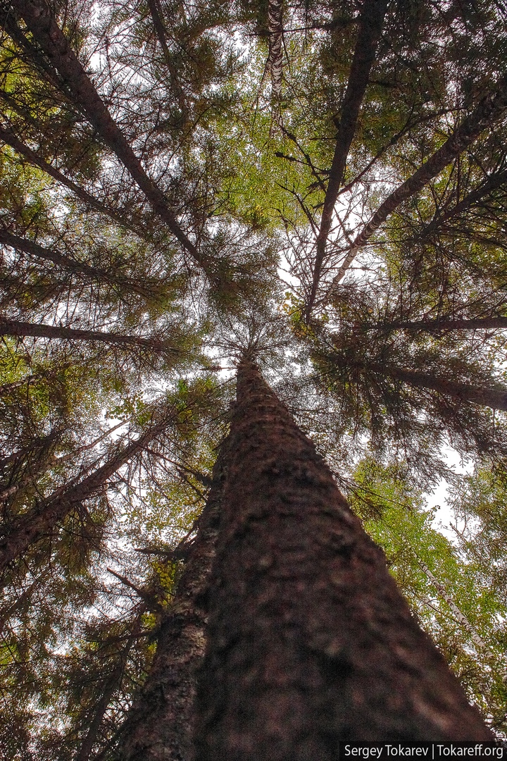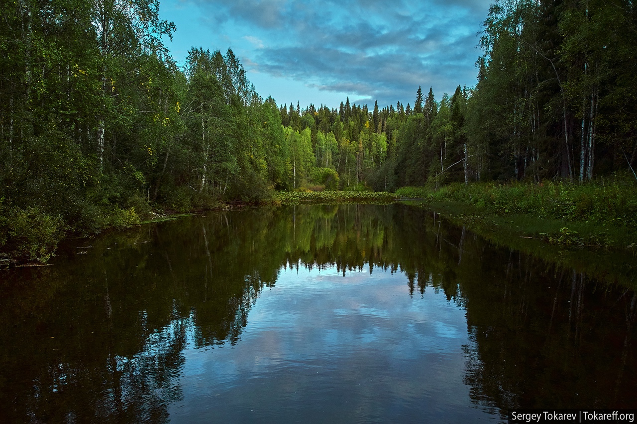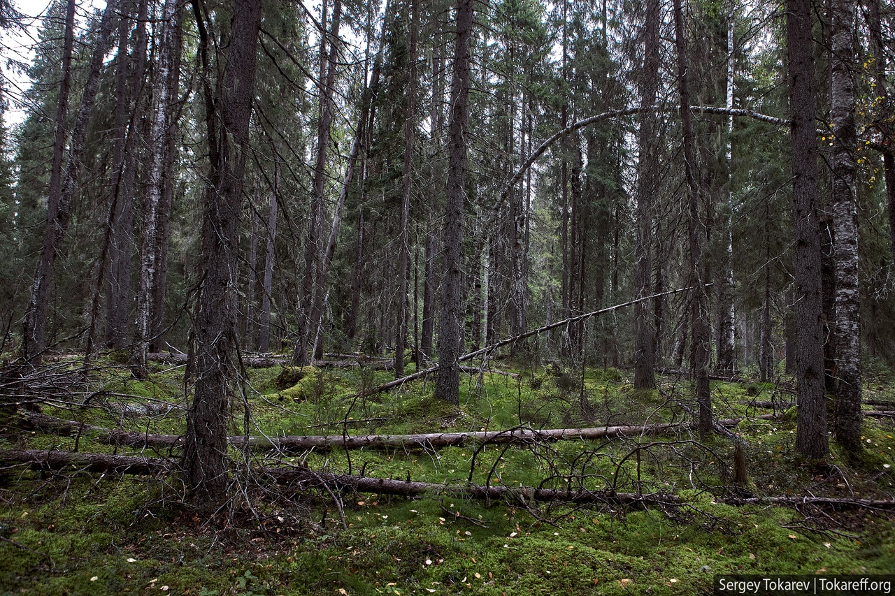 Местность тут песчаная, и река идет ниже берега на несколько метров. Почву постоянно подмывает и в воду падают громадные ели, перегораживая русло. В некоторых местах приходится ювелирно проводить лодку прямо под упавшими стволами.
