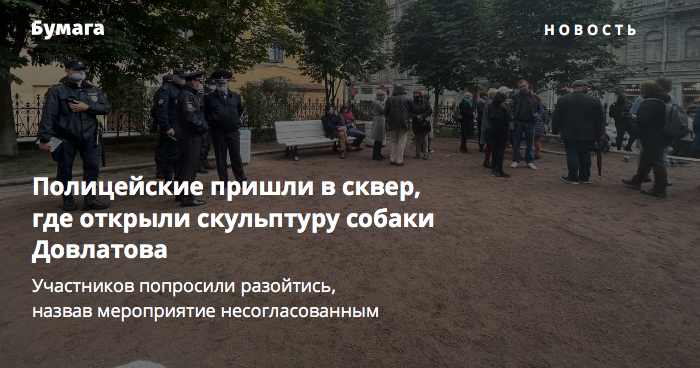 В сквер Довлатова на Загородном проспекте, 17, где днем 4 сентября состоялось открытие памятника собаке писателя, пришли сотрудники полиции Петербурга. Об этом с места события сообщает корреспондентка «Бумаги».