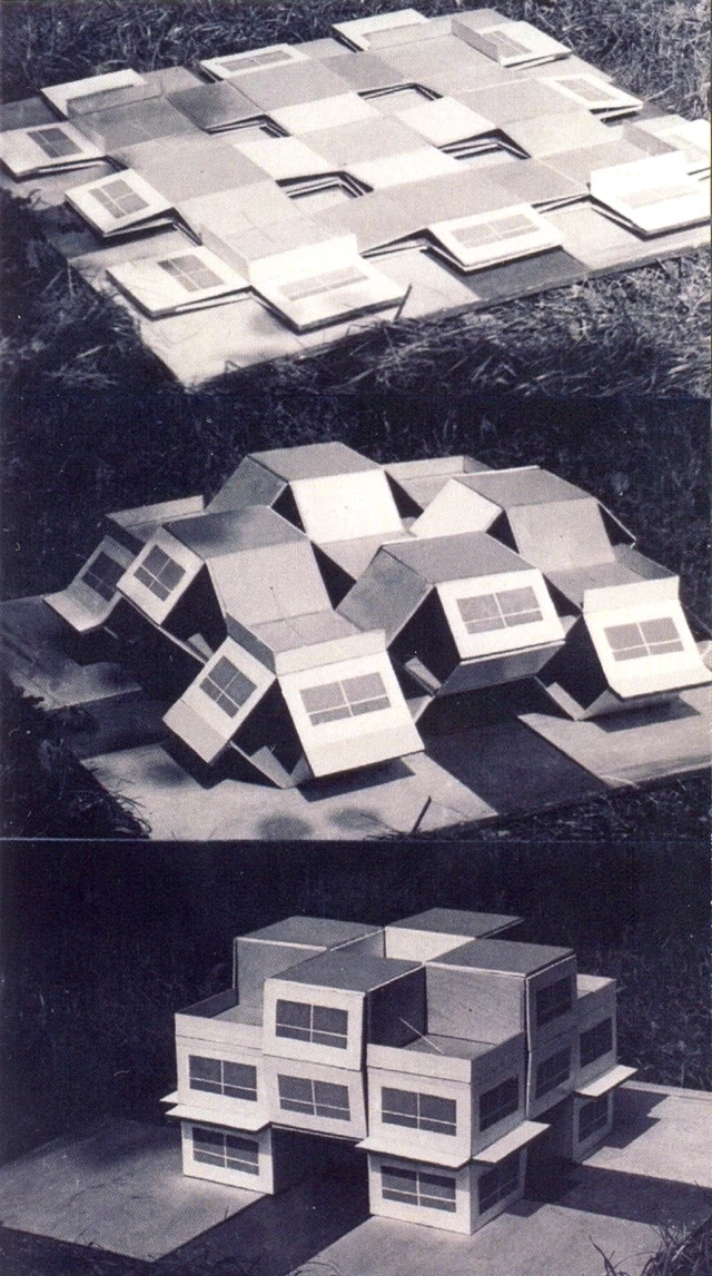 дом сам, словно бы по щучьему велению, вырастает над землей. Приготовленные заранее на стройплощадке плиты стен и потолков сами поднимаются и складываются в новое здание.
