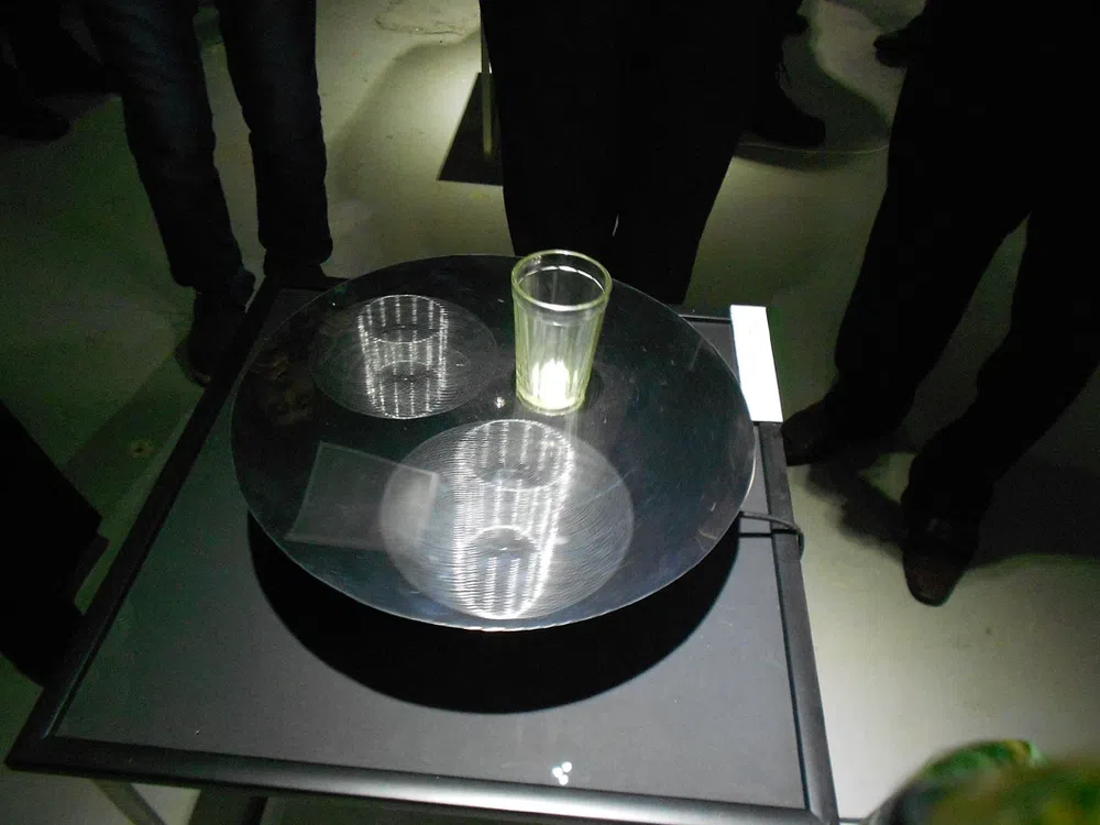 На выставках Вячеслав демонстрировал этот способ стаканами «на троих», расположенными на вращающемся металлическом диске. Стаканы оборачиваются к нам всеми своими гранями. Но лишь один из них — материальный, а два — иллюзорные.