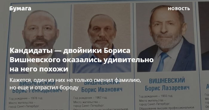 Стало известно, как будут выглядеть плакаты, которые повесят на избирательных участках округа № 2, пишет «Фонтанка». В этом округе в депутаты Законодательного собрания выдвигаются сразу три Бориса Вишневских. По данным издания, на плакатах все три кандидата будут очень похожи друг на друга — два из них начали носить бороды лишь недавно.