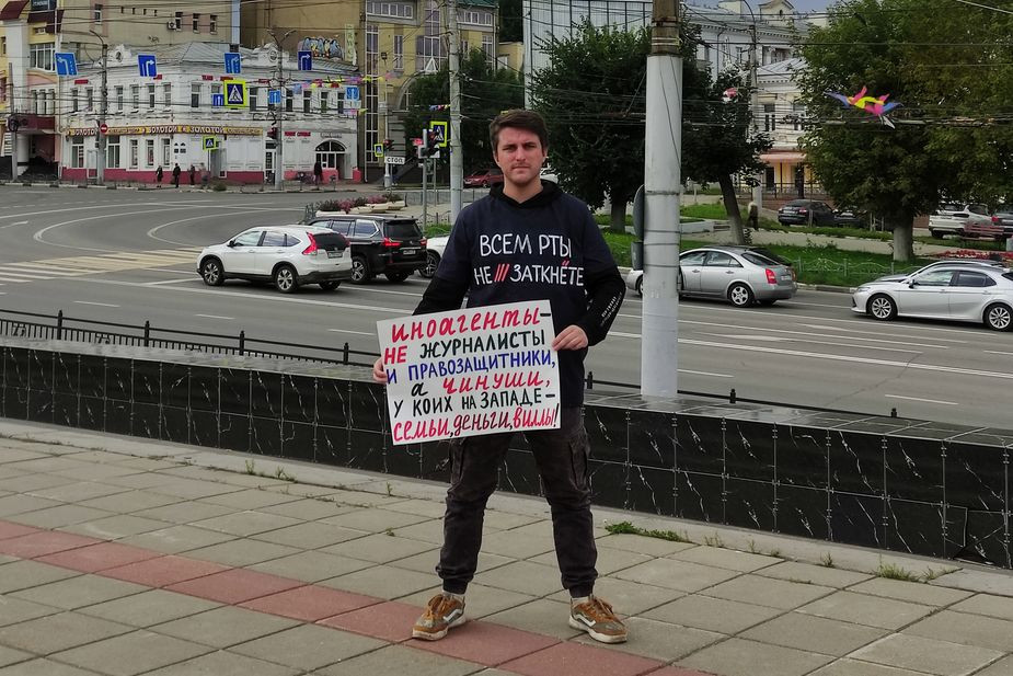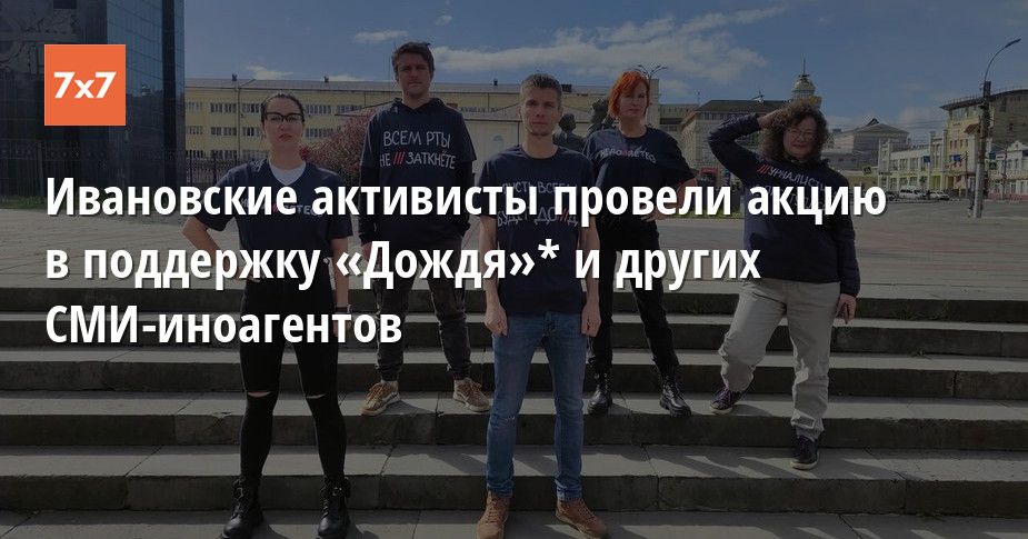 В Иванове на площади Революции 5 сентября прошла акция против практики присвоения независимым СМИ статуса иностранных агентов. Активисты провели одиночные пикеты и сфотографировались в футболках с протестными надписями. Полиция на происходящее никак не реагировала. Об этом «7х7» рассказали участники акции.