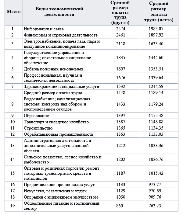 Средние зарплаты в Эстонии по видам экономической деятельности: