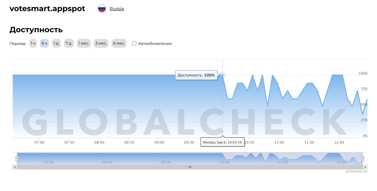 Согласно данным сервиса Globalcheck, до 10 утра по московскому времени доступность сайта «Умное голосование» составляла 100%, а затем начались перебои.