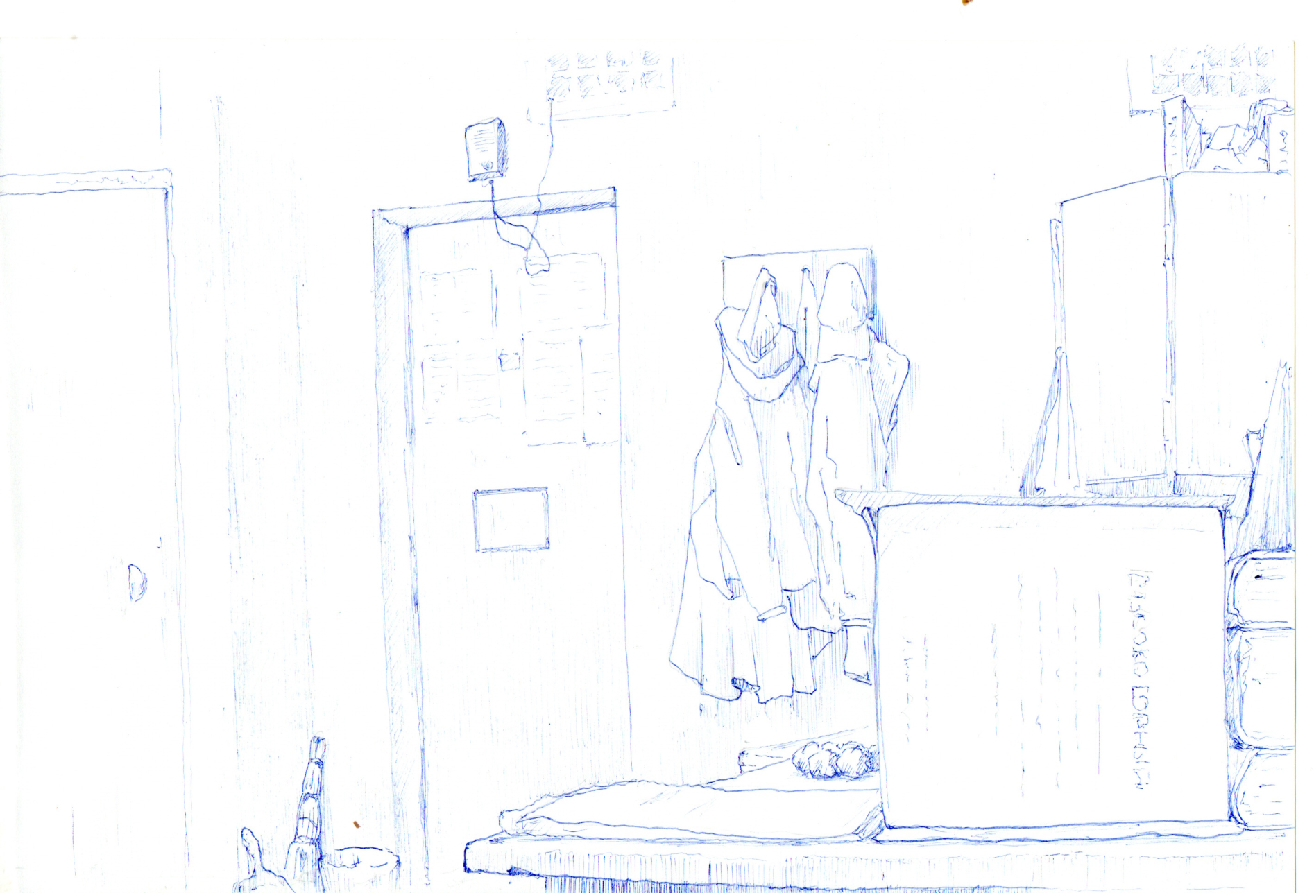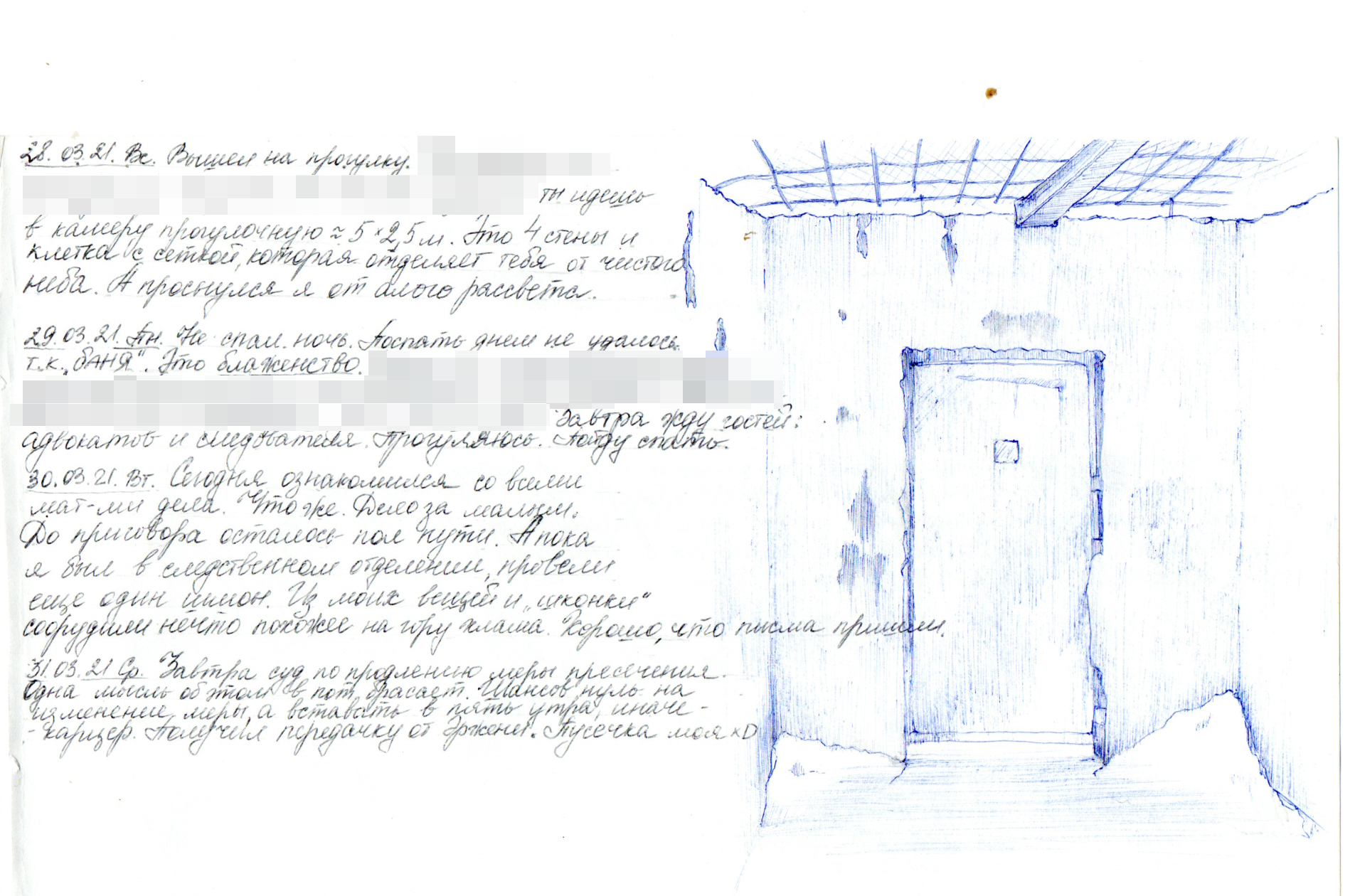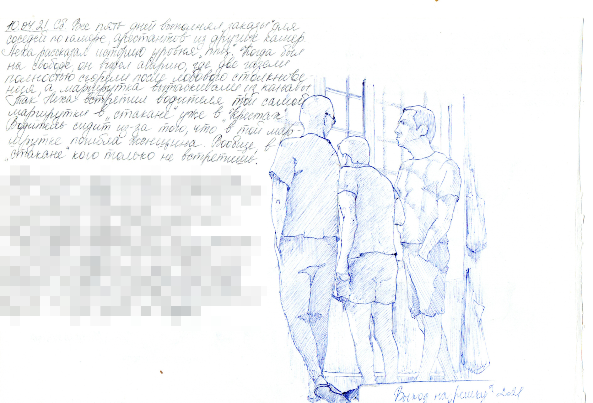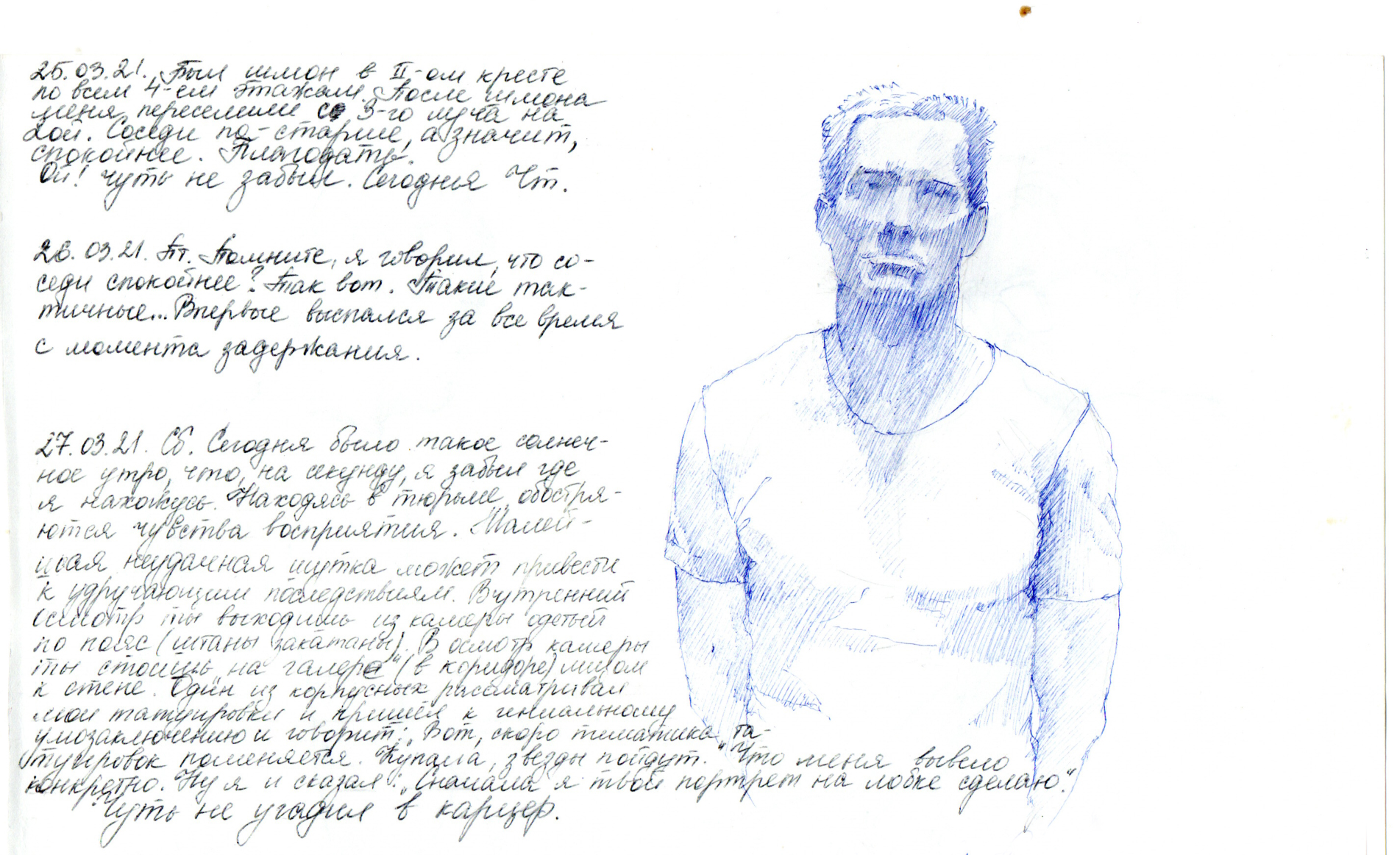 Октябрьский районный суд Петербурга приговорил художника Илью Першина к трем годам колонии-поселения, гособвинитель запрашивал на два месяца больше. По версии следствия, 31 января на акции в поддержку Алексея Навального Першин догонявшего его омоновца одновременно в грудь и под коленную чашечку сзади. На единственной доступной видеозаписи инцидента ударов не видно, других съемок в деле нет — в день митинга городские камеры наблюдения якобы не работали. На следственном эксперименте статист с четырех попыток не сумел повторить удар, который следствие приписывает художнику. «Медиазона» публикует рисунки из его тюремного дневника.