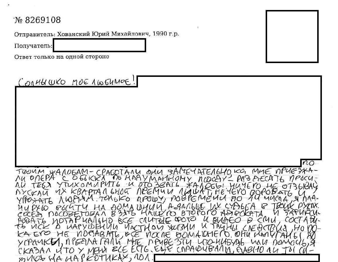 После этого девушка подала несколько жалоб в разные ведомства. По ее словам, примерно через две недели к Юрию Хованскому в СИЗО пришли оперативники — об этом она узнала из письма от своего молодого человека.